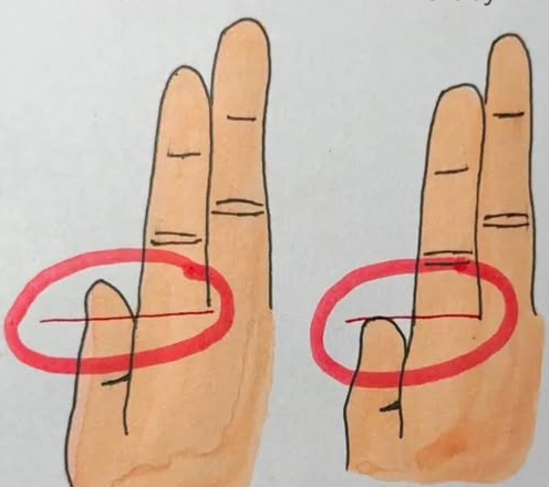 Poniższy obrazek przedstawia dwie dłonie obok siebie, z czerwonymi okręgami oznaczającymi różnicę między długością palca wskazującego i serdecznego.