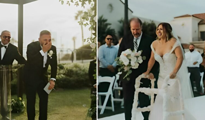 I jak widać na zdjęciu, gdy Pan Młody się odwrócił, był zszokowany i wzruszony do łez. Zaskoczony i ogarnięty wzruszeniem nie mógł uwierzyć własnym oczom: kobieta jego życia, której nigdy nie widział idącej, wstała i powoli zmierzała wraz z ojcem w stronę ołtarza.