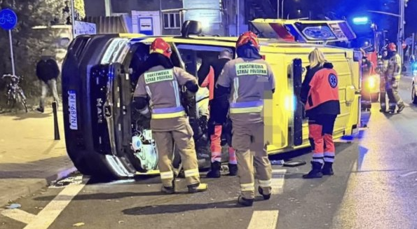 Ambulans, będący w trakcie transportu pacjenta do szpitala, wjechał na skrzyżowanie, korzystając z sygnałów dźwiękowych i świetlnych. Niestety, na tym samym skrzyżowaniu pojawiła się taksówka, która uderzyła w bok karetki. Siła zderzenia spowodowała, że pojazd uprzywilejowany przewrócił się na bok.