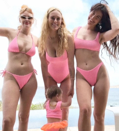 Las chicas se relajaron en una villa con piscina. Las hermanas mostraron sus esbeltas figuras con looks playeros con los colores de Barbie. Rumer eligió un original bañador de una pieza con escote, Scout, de 32 años, un modelo más deportivo con top y braguita, y Tallulah, de 30 años, un diminuto bikini.