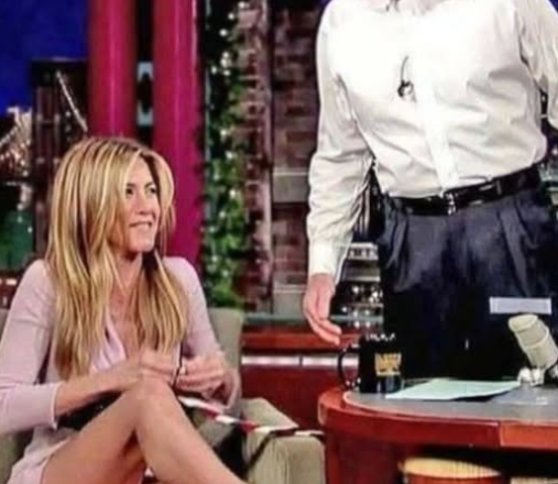 Ubrana w stylową czarną bluzkę i szorty, Aniston stała się obiektem niechcianego zainteresowania. Uwagi Lettermana – nazwanie jej nóg „ogromnymi” i „kształtnymi” – wyraźnie ją zaniepokoiły. Chociaż zbyła to śmiechem, próbując zmienić temat rozmowy, Letterman nie ustępował. Wracał do tematu nie raz, mówiąc: „Nie mogę się nadziwić twoim nogom”, a nawet żartował, że chciałby, żeby ktoś nagrał tę chwilę w domu.