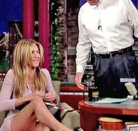 Ubrana w stylową czarną bluzkę i szorty, Aniston stała się obiektem niechcianego zainteresowania. Uwagi Lettermana – nazwanie jej nóg „ogromnymi” i „kształtnymi” – wyraźnie ją zaniepokoiły. Chociaż zbyła to śmiechem, próbując zmienić temat rozmowy, Letterman nie ustępował. Wracał do tematu nie raz, mówiąc: „Nie mogę się nadziwić twoim nogom”, a nawet żartował, że chciałby, żeby ktoś nagrał tę chwilę w domu.