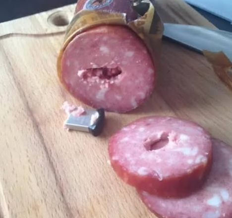 Ale gdy tylko zacząłem ją kroić, nóż napotkał nieoczekiwany opór, jakby w środku znajdowało się coś twardego. Założyłem, że może trochę zamarzła przez noc. Mimo to, gdy spróbowałem pokroić kolejny kawałek, ostrze znów się zatrzymało. Zaciekawiony, zdałem sobie sprawę, że jestem bliżej i zamarłem. Coś metalicznego lśniło w środku kiełbasy.