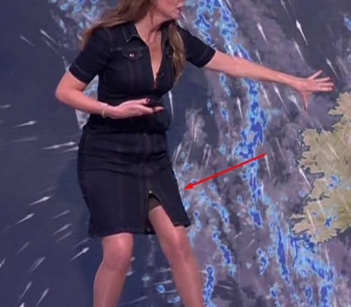 49-letnia pogodynka wystąpiła w krótkiej jeansowej sukience. Podczas wskazywania grafik na ekranie kamery przypadkowo uchwyciły fragment koronkowego wykończenia jej pończoch, co wywołało niemałe poruszenie wśród widzów.